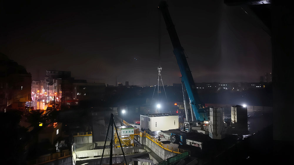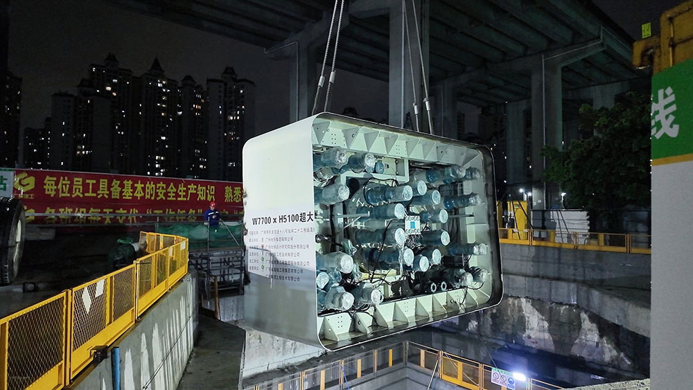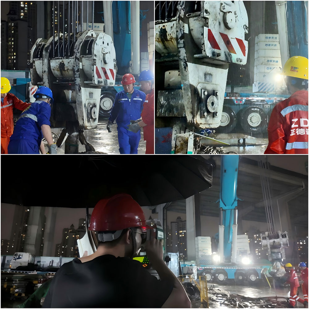 施工当日傍晚,广州番禺区突降暴雨,雨幕如帘笼罩南浦西站工地。粤润通团队在15分钟内完成三级应急部署,700吨吊车与300吨吊车在雨中稳如磐石,顶管机悬停半空,一场与天气赛跑的吊装战正式打响。