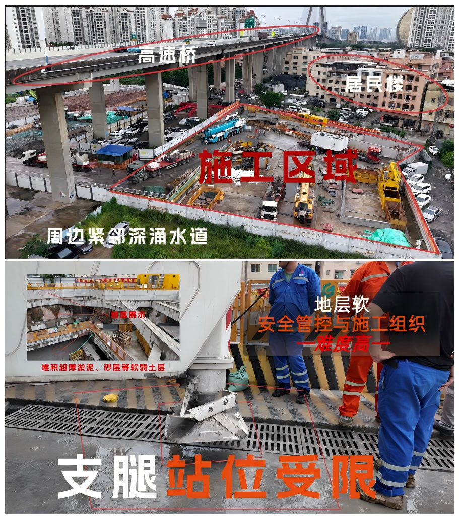 鉴于车站周边环境复杂——东侧紧邻高架桥,南端濒临深涌水道,且工程地质条件复杂:地层软硬差异显著,地下水丰富,分布超厚淤泥、砂层等软弱土层,故安全管控与施工组织难度较高。