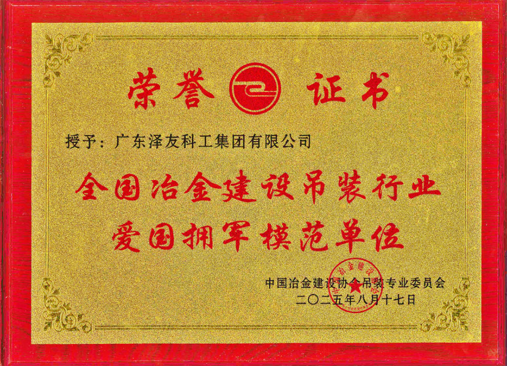 在本次年会表彰环节中,泽友科工以其体系化、常态化的爱国拥军举措,获评 “全国冶金建设吊装行业爱国拥军模范单位”。作为行业内颇具分量的社会责任奖项,该荣誉绝非偶然,而是源于泽友科工长期以来对爱国拥军工作的笃定坚守。