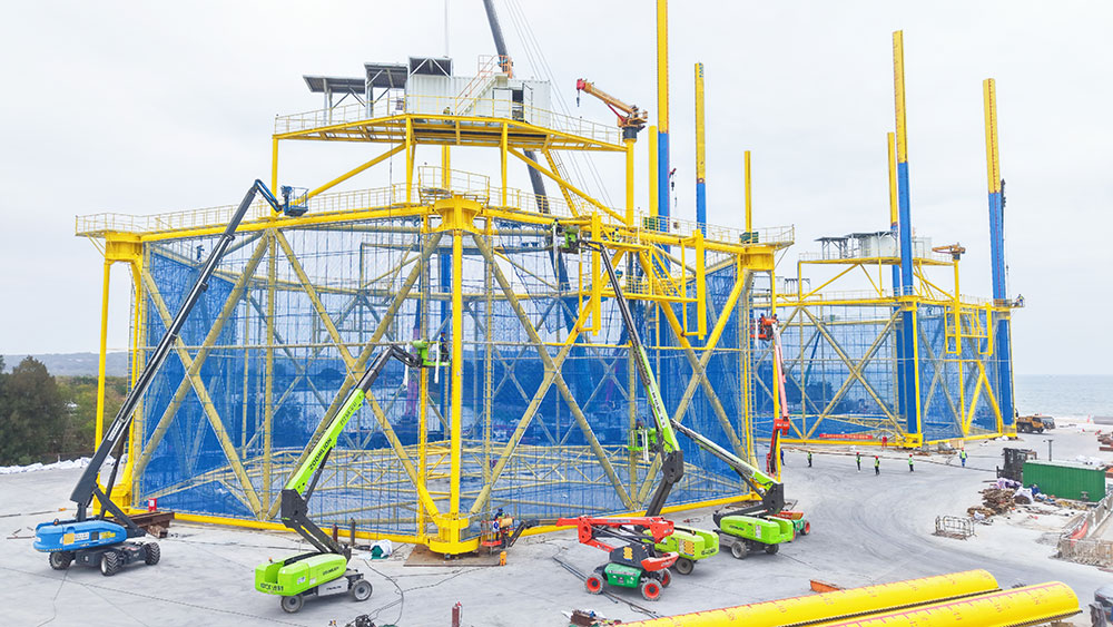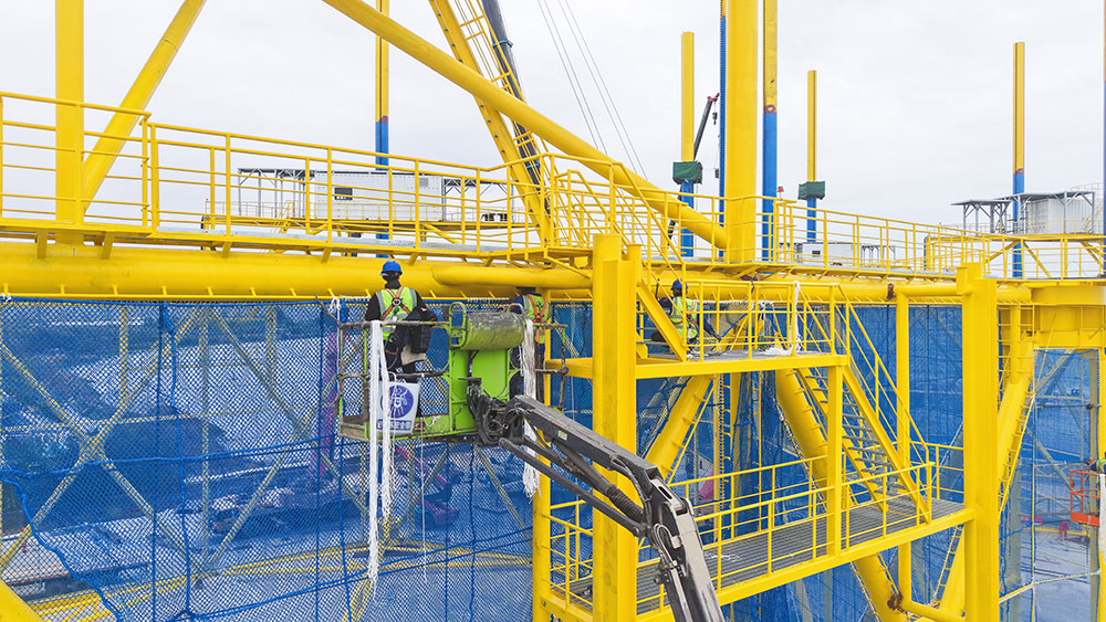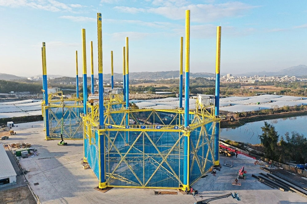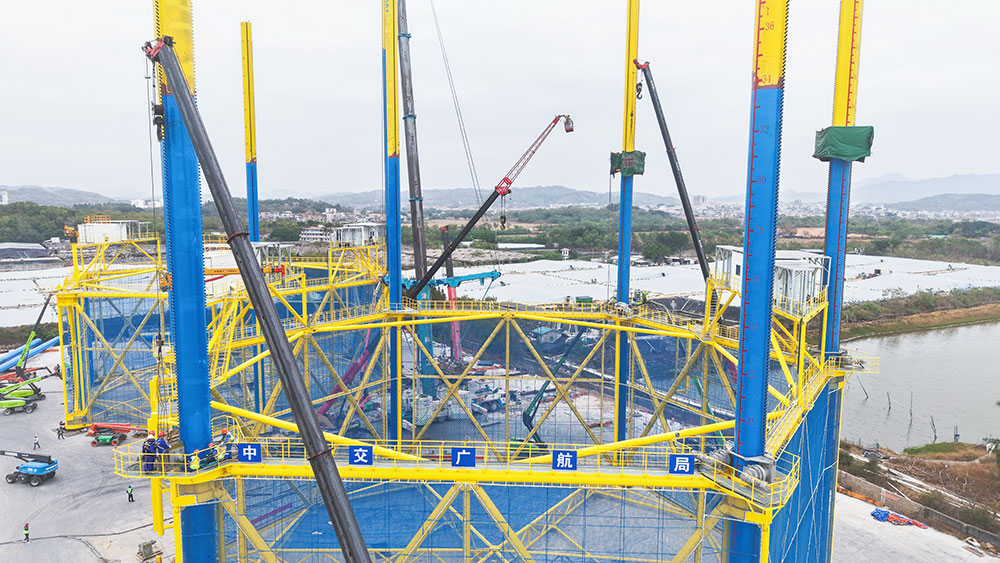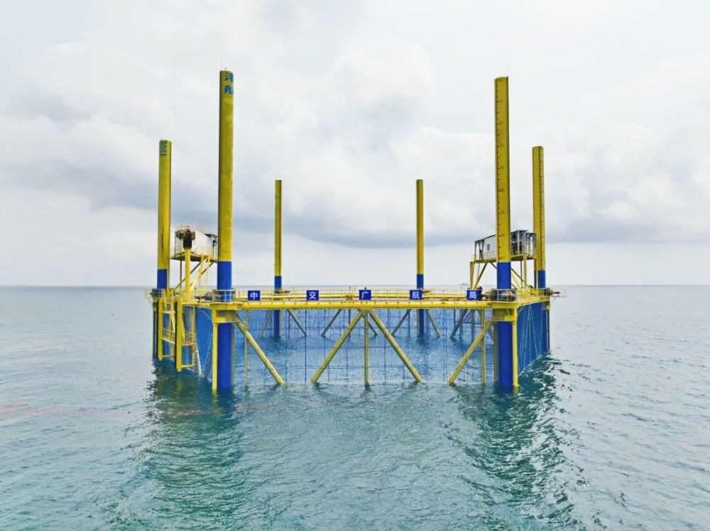 插桩可沉降桁架网箱俯视外形边长为24.5米正六边形,高度17米,整体重量约900吨。